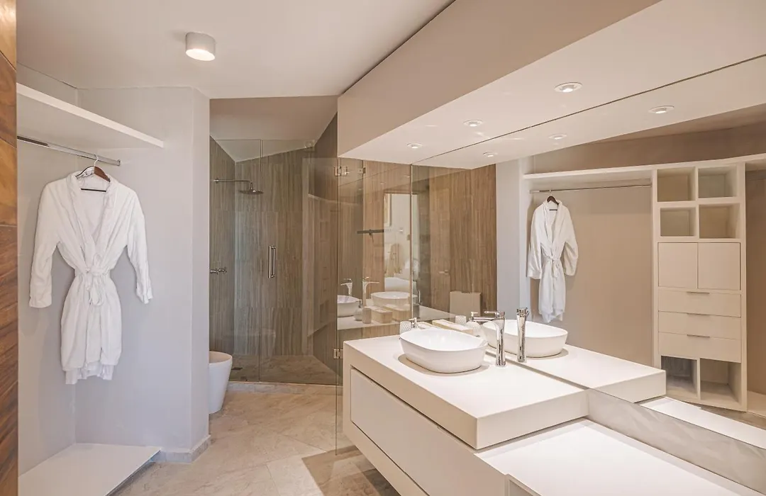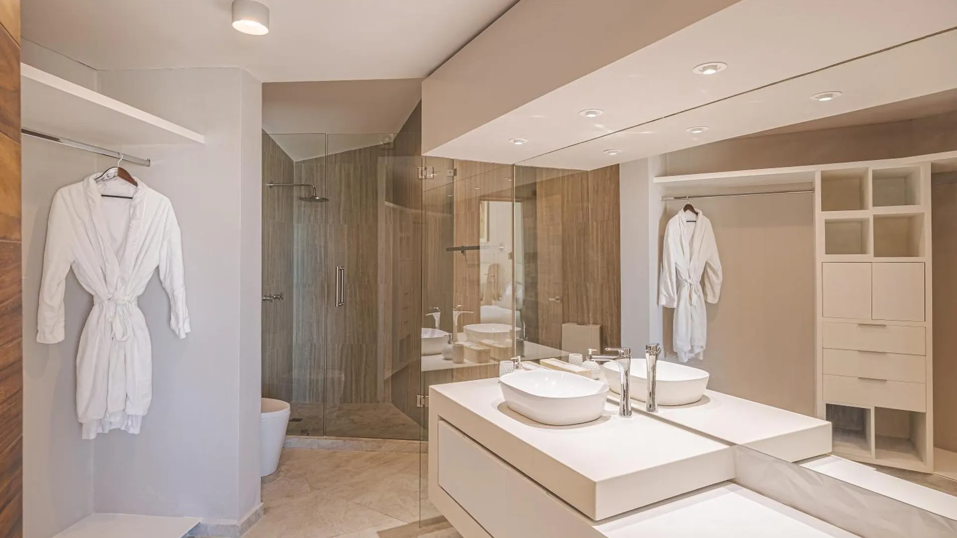 Il bagno comprende anche una vasca idromassaggio e una doccia.